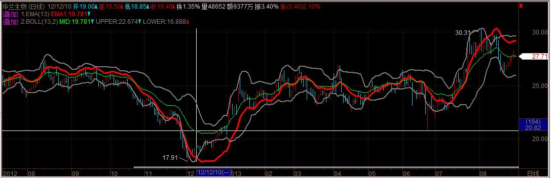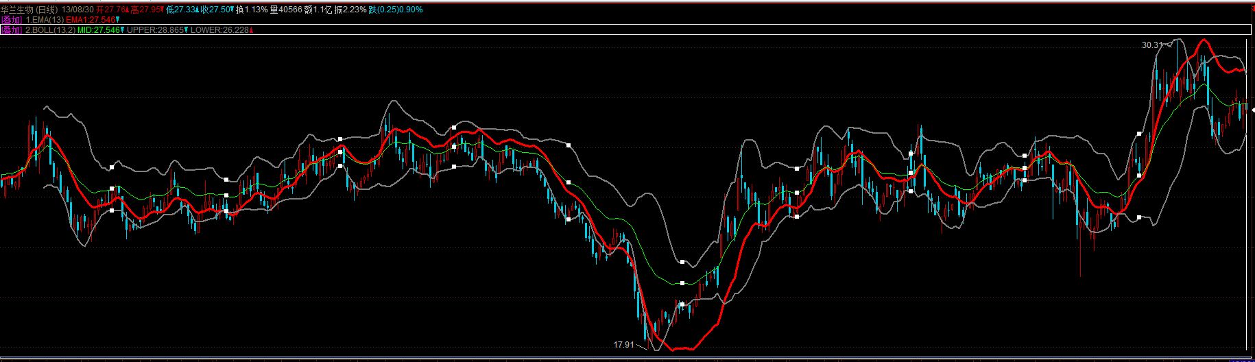 两个公式,都包含EMA(CLOSE,13), 但图形上显示两条不同的线, 数值却一样, 没有使用NOAXIS.