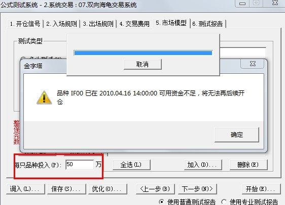 资金改为50万,可2010.4.16当天就说资金不足,无法继续开仓。这个不对吧?另外,我在一楼的问题请教老师解答