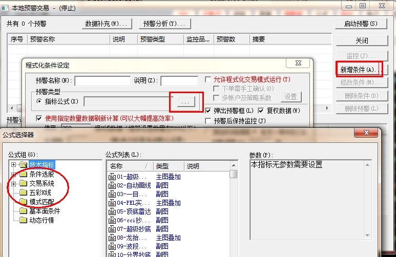 您好,交易菜单打开预警   点击新增条件  选指标
