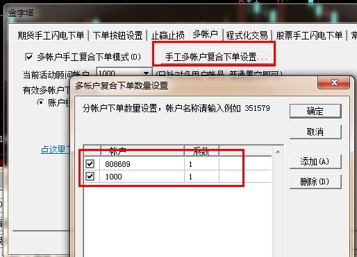 现在的情况是我希望人工干预的时候全部账户都操作,手工多账户复合下单的设置也都选了。但实际上有时只给一个账户下单,有时给全部账户下单。