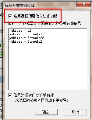 应该是你启用了信号过滤,却没有选择要启用的公式在下面列表里选中要自动下单的策略名即可