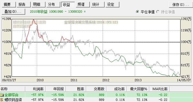 请问第二个图中红色的是资金曲线,和历史回测非常不一样,是怎么回事,时间都能对上啊,螺纹钢 从2009年3月27日 到今天的测试