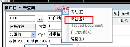 账户栏上方点击右键-》停驻 放在一个固定的地方就不会遮住k线了