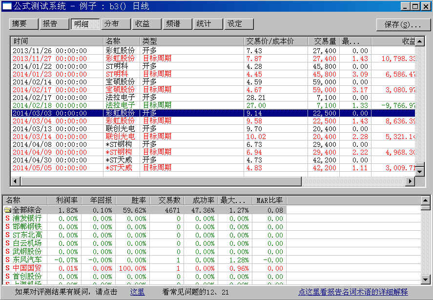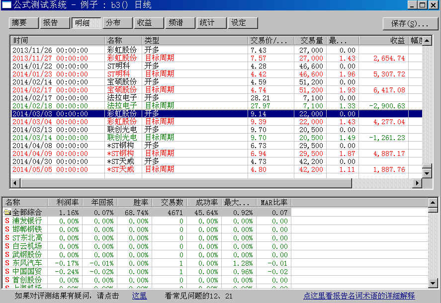 请问该测试中2014年03月3日买入的600707 彩虹股份买入价是9.14元,3月4日卖出是9.39元,我设置的平仓是条件是2%,而且是盘中触价平仓,我的理解应该是9.14*1.02=9.32元,而不是中价(9.58+9.14+9.45)/3=9.39.请高手告知,谢谢!