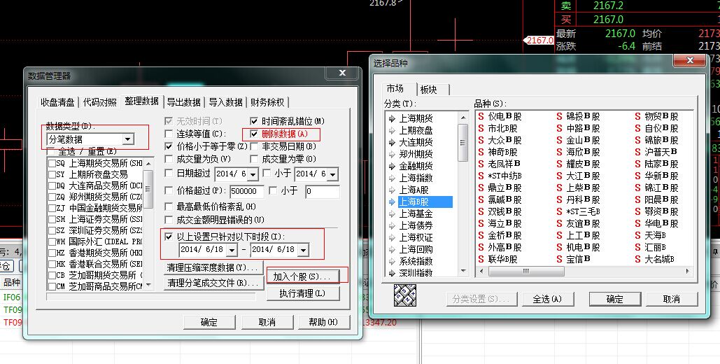 请问:在“数据管理器”中,如果需要删除20140112---20140225的“上海B股"分笔数据,该如何具体操作(先后步骤)??