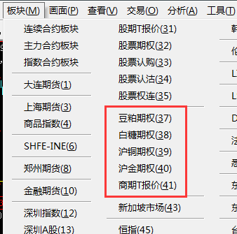 可以从板块中去打开商品期权的列表,没有专门交易商品期权的范例,可以参考系统中的其他案例;