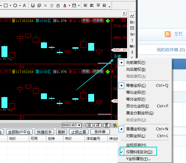 2,k线压缩成一条线了,k线图右边价格轴 点右键,勾选紧随k线变动