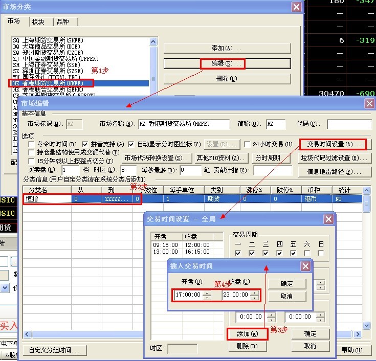 在"市场分类"/市场里,选中HZ香港期货交易所,点编辑.