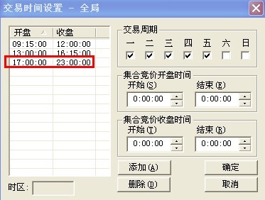 在"交易时间设置-全局"对话框里,将看到一个新增加的交易时段如下图,点确定.
