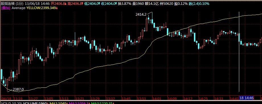 你好,我编了一个一分钟分时均线指标,但是叠加在k线上时,会在k线上下移动?另外,黄线图表显示与实际值不同,比如14:46,黄线值比收盘价低,按理该在k线下方,却显示在k线上?