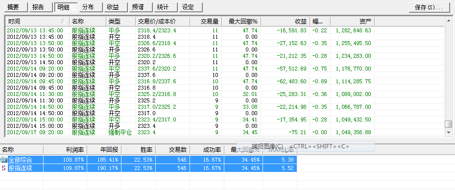 2012/09/14 09:45:00    股指连续    平多        2316.8/2337.6    10        -62,483.60     -0.89                  1,114,285.75    47.74