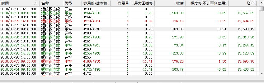 我是这么来的,海龟公式,一切默认都是日线2010-1-1 到2013-7-1, 但选择 RB00 交易1万元。 虽然中途会没钱测试不下去,但也有5个交易。