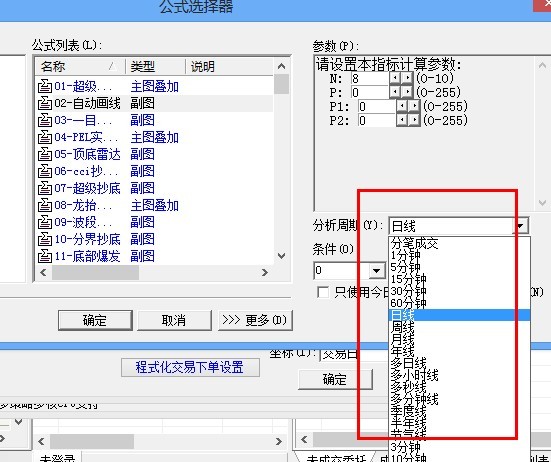 您好,图表交易的周期设置在 设置-》选项 中,后台周期设置在 交易-》后台交易-》新增条件-》指标公式