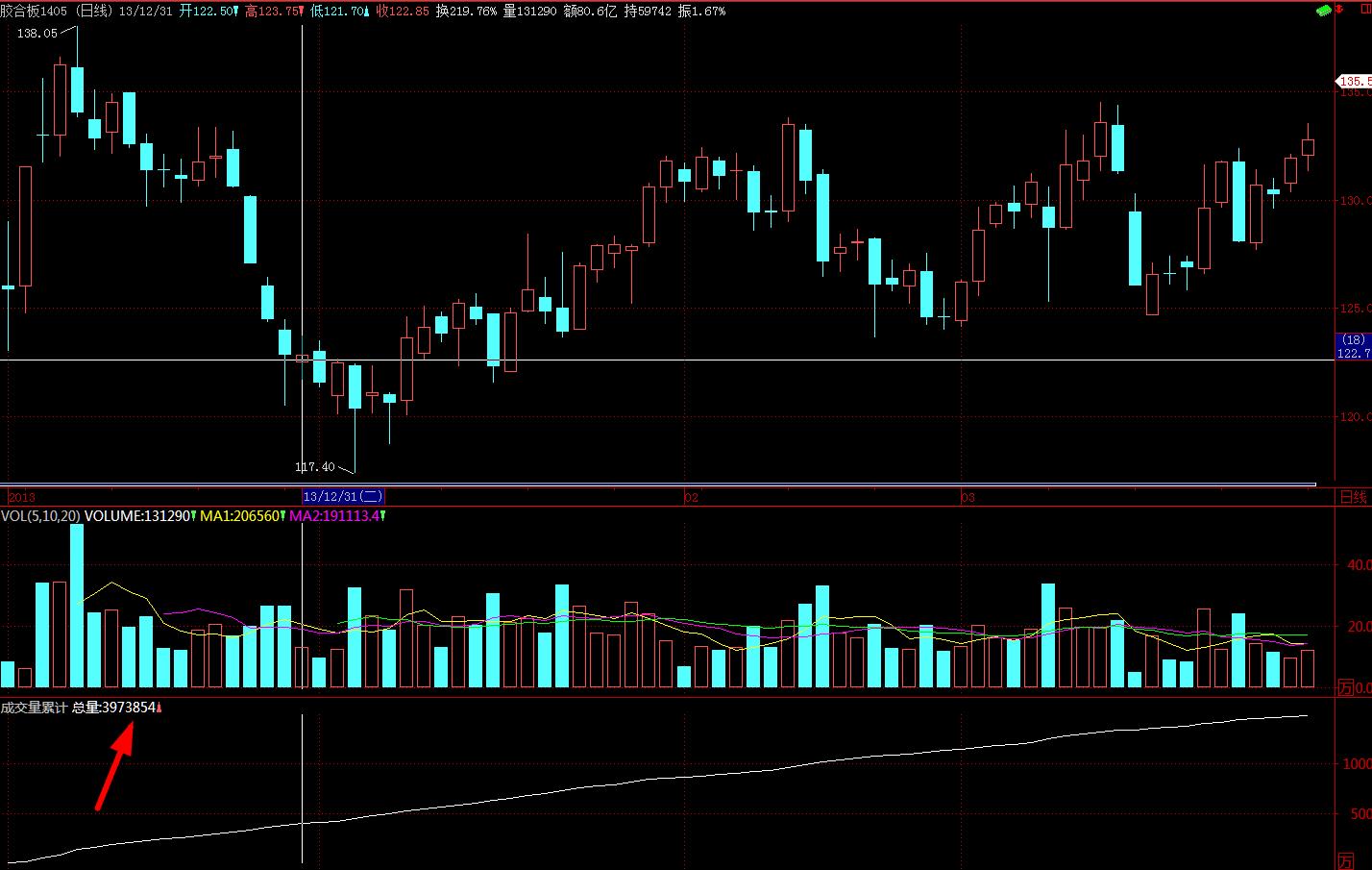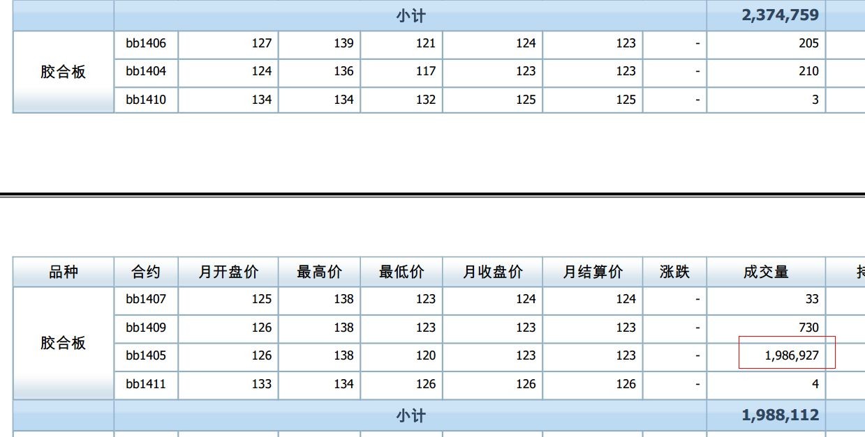 交易所公布的统计BB05的成交量到2013/12/31日,量为1986927,如图1的红色框选