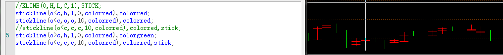 是的,stick试过,在主图和副图中也试过,还是这个样子的,开盘、收盘就是直接在当中而不再两边的,下图是我运行后一起剪切来的图样,bars棒还是不行。